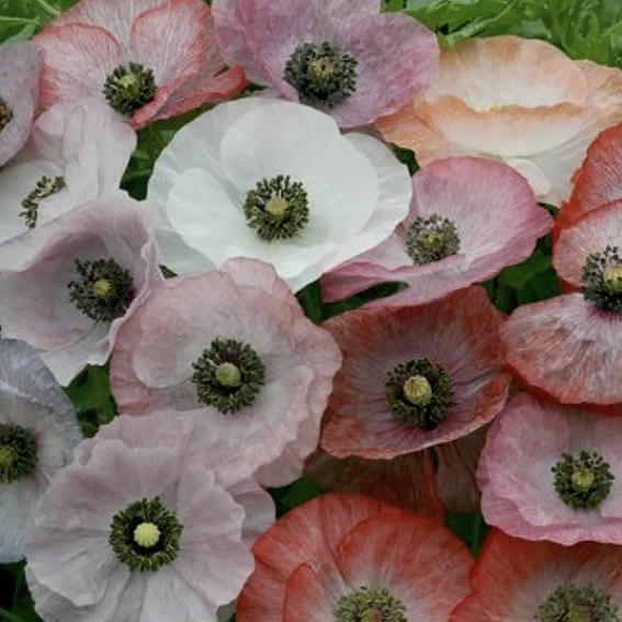 Маки в прекрасной смеси бледных и дымчатых оттенков серой, сиреневой, лиловой, розовой, нежно-оранжевой и белой.