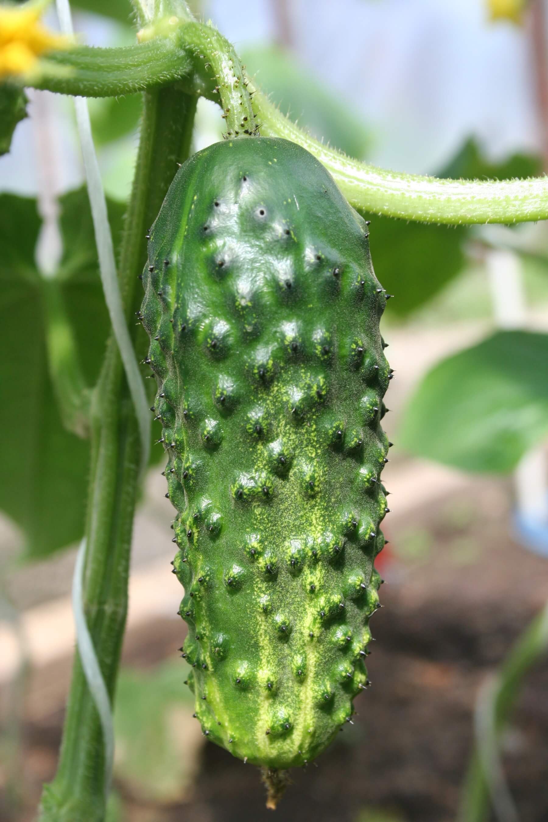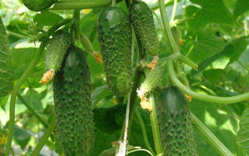 В каждом узле формируется по 2-4 завязи. Плоды длиной 10-12 см, диаметром 3,0-3,5 см, массой 90-110 г, зеленые со светлыми полосами, крупнобугорчатые, черношипые.