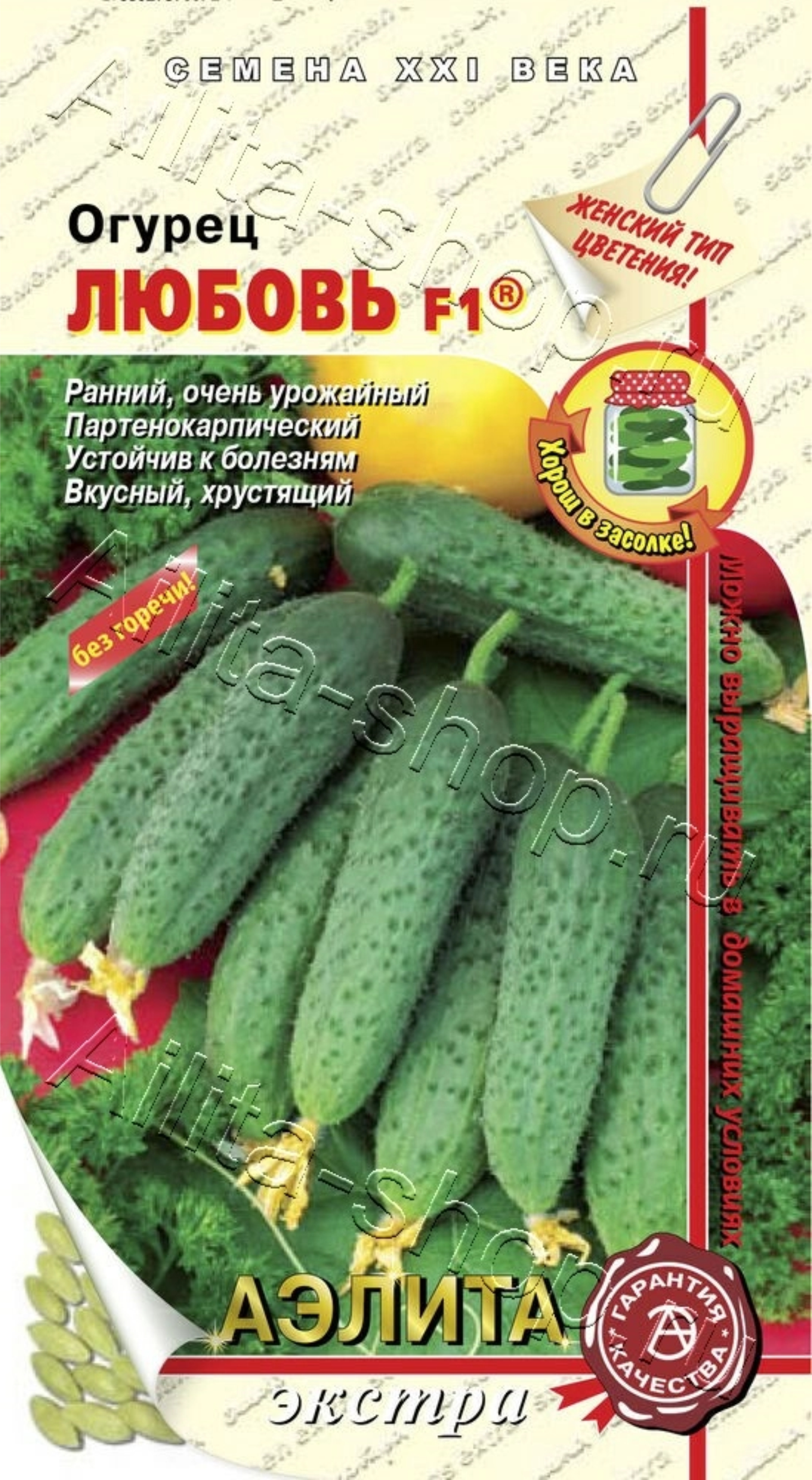 Раннеспелый высокоурожайный партенокарпический гибрид нового поколения преимущественно женского типа цветения. Не требует опыления пчёлами. Устойчив к вирусу огуречной мозаики, оливковой пятнистости, настоящей мучнистой росе, толерантен к ложной мучнистой росе. Растение средневетвистое, индетерминантное. Плод цилиндрический, средне-зеленый, массой 72-80 г, длиной до 13 см. Зеленец хрустящий, без горечи. Гибрид рекомендован для потребления в свежем виде и консервирования. Компания «АЭЛИТА» является эксклюзивным продавцом семян гибрида огурца «Любовь F1®». Агротехника: Для огурца пригодны плодородные среднесуглинистые, воздухопроницаемые почвы. Хорошие предшественники - картофель, лук, капуста, перец. Огурцы выращивают, высевая семенами в грунт или через рассаду. Посев: на глубину 1,5-2 см при t° 25°C. Затем температуру понижают до 20°C. Семена высевают в грунт в конце мая при t° земли выше 13°C и t° воздуха выше 15°C. Высадка рассады: когда минует угроза заморозков. Плотность посадки 3-4 растения на 1 м2.