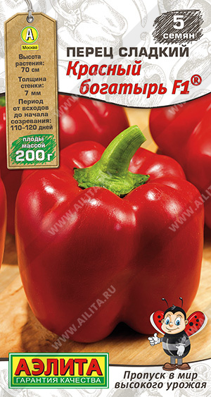 Урожайный и красивый гибрид с вкусными и сочными плодами «богатырского» размера. Скороспелый, первый урожай созревает на 110-120 день после появления всходов. Растения высотой 0,5-0,7 м, полуштамбовые, полураскидистые. Плоды крупные, блестящие, насыщенного красного цвета, массой 190-200 г. Толщина стенок 6-7 мм. Кусты очень обильно плодоносят в парниках (8-9 кг/м 2 ) и в открытом грунте. Ароматные перцы великолепны в свежем виде и в консервированных заготовках.