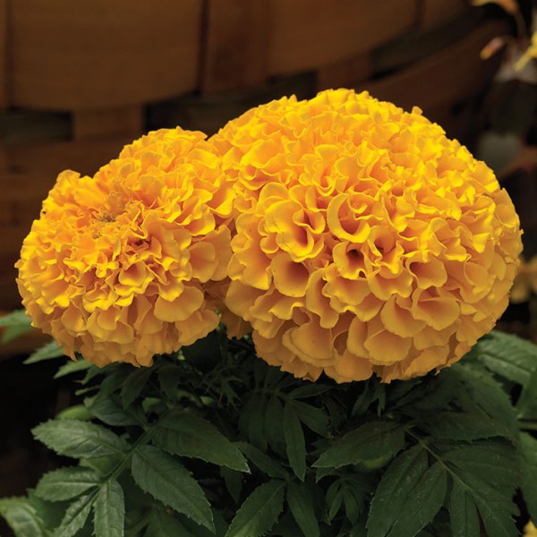 Раннецветущие прямостоячие бархатцы. Обладают высокой выравненностью растений, имеют компактный кустистый габитус. Высота кустика 30-35 см, диаметр - около 25 см. Крепкие стебли увенчаны пышными махровыми соцветиями, представленными в трех ярких окрасках: золотистой, оранжевой и желтой. Все окраски в серии зацветают одновременно, что позволяет с успехом комбинировать их в ландшафтных композициях.