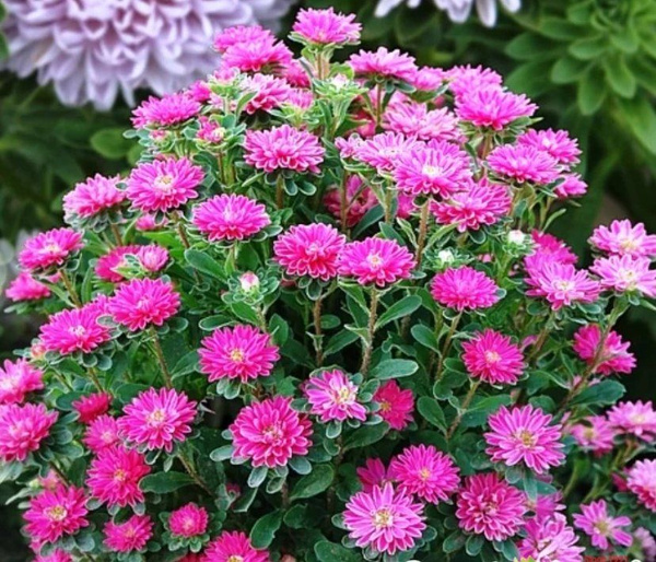 Одно растение формирует 40-60 боковых побегов второго порядка, формирующих изящные цветки, диаметром 2-2,5 см, состоящие из ланцетовидных лепестков, расположенных по окружности в несколько слоев, чем ближе лепестки к центру цветка, тем они меньше, что обеспечивает очаровательную махровость. Все части растения очень жесткие и прочные. Такие растения не повреждаются ветром и дождями – прекрасно стоят на открытом воздухе. Эти астры можно выращивать как на клумбах, так и в качестве горшечной культуры.