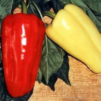 Плод пониклый, конусовидной формы (15х6 см), глянцевый до сильноглянцевого, окраска в технической стадии спелости желтоватая, в биологической - красная. Масса плода 100-120 г, толщина стенки 6-7 мм.