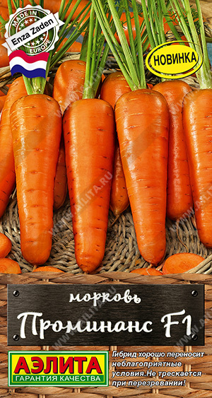 Высокоурожайный гибрид моркови от компании Enza Zaden (Нидерланды). Среднеспелый – от всходов до хозяйственной годности 95-105 дней. Сортотип Курода/Шантанэ. Корнеплоды длиной 16 -19 см, массой 120-220 г. Выровненные, гладкие и очень высокого качества. Сердцевина насыщенно-оранжевого цвета, отличного вкуса, с высоким содержанием каротина. Листовой аппарат мощный, устойчив к альтернариозу. Гибрид хорошо переносит неблагоприятные условия, при перезревании не трескается. Рекомендуется для употребления в свежем виде, консервирования, замораживания и краткосрочного хранения.