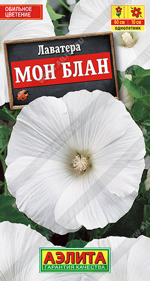 Один из самых эффектных летников. По критерию «неприхотливость и красота цветения» с сортом Мон Блан мало что может сравниться. Куст более густой и более низкий (60 см), чем у большинства лаватер. Крупные белоснежные цветки диаметром 10 см с легким блеском хорошо заметны даже в темноте. Не раскрытые бутоны имеют нежнейший розовый оттенок. Сорт идеально подходит для садов в природном стиле, для живой из городи с целью зонирования участка, для срезки в букеты. Рекомендуется также для оформления крупных садовых контейнеров.